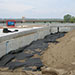 Following soil borings, testing of four potential fill materials, and cost considerations, Gale Tec Engineering Inc, determined Green Aggregate Fill (tire shreds) was the best choice for solving this civil engineering challenge. In addition to being the least expensive option, shredded tires are about one-third the weight of regular soil and possess shear strength that prevents slides. The light weight property of the shredded tires, placed on top of the existing soft soils, reduced the pressure that could increase future slope failure. Their ability to interlock when compacted during installation increases the strength of the slope, providing additional support and safety in this part of the project.